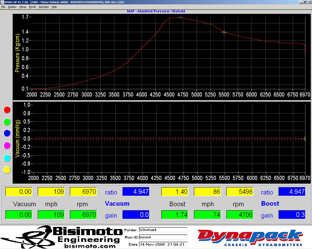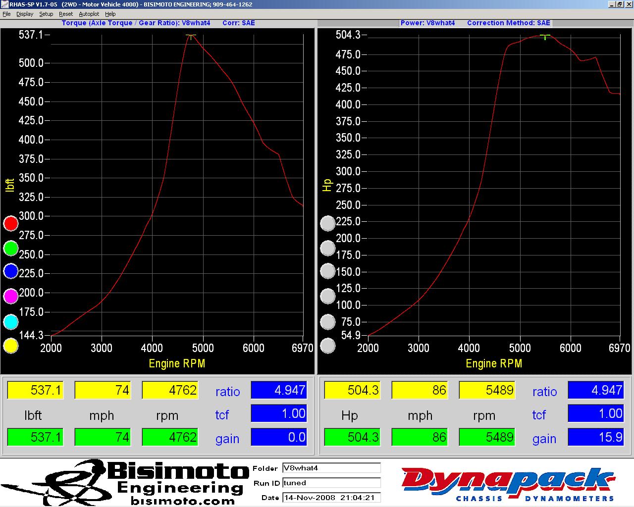 Friday, November 14th 2008 around 11:00PM we set a new mark with 504.3 RWHP through stock twins.